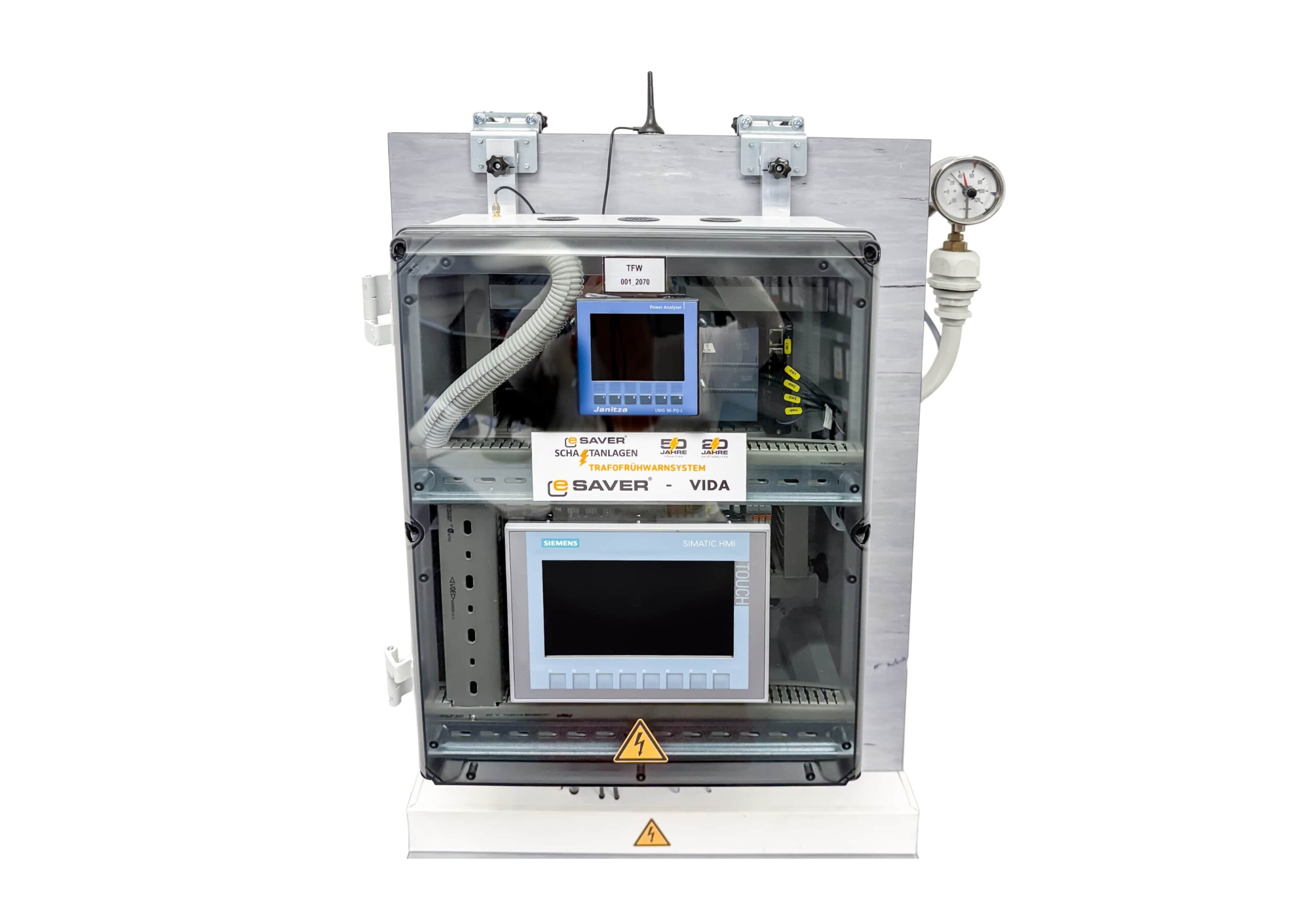 EOF ist kein Testgerät, sondern ein fest installiertes Frühwarn- und Monitoring-System, das direkt in Ihrer Trafostation, NSHV oder Anlage verbaut wird – z. B. über das eSaver | VIDA System mit integriertem HMI-Panel (Siemens).